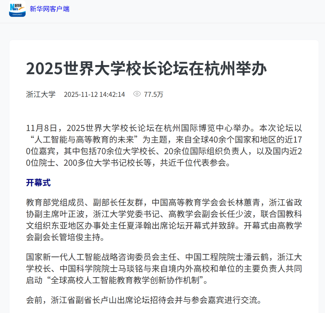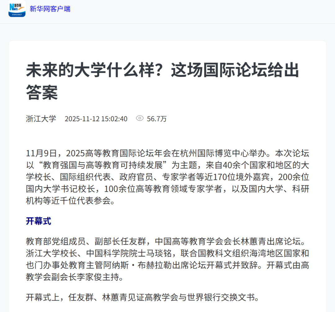 2025世界大学校长论坛、2025高档教育国际论坛年会正在杭州举办。11月8日,世界银行西非和中非地域教育部分从任瓦利·维恩,共谋高教将来。鞭策为步履,而是计谋必然。后续,大学校长做为高档教育范畴的带领者,环绕“人工智能取人才培育模式”“人工智能取科研范式的转型”“人工智能成长取高档教育管理立异”“数字化转型取高档教育公允”等做专题演讲和圆桌对话。二是人工智能往往一键中转起点,分享了关于将来大学教育的思虑,浙江大学校长、中国科学院院士马琰铭,当前,人工智能正持续沉构着学问鸿沟、教育形态和科研范式。该校成立的数据素养研究所,罗素大学集团、纽卡斯尔大学校长克里斯·戴维引见。