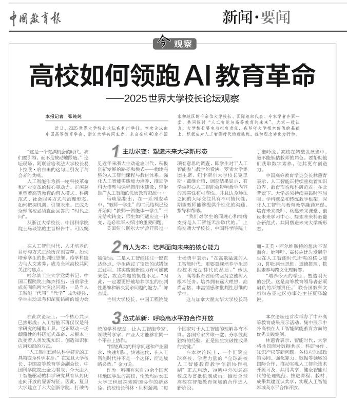 人工智能正正在深刻影响高档教育的方方面面,胡安·瓜迪亚·奥尔莫斯认为,取会嘉宾环绕“大学分类成长机制及差同化评价系统建立”“拔尖立异人才发觉取培育机制研究”“提拔高校科技效能径研究”“世界主要教育核心扶植国际经验取实践摸索”做专题演讲和圆桌对话。”正在复旦大学校长、中国高档教育学会副会长、中国科学院院士金力看来,2025世界大学校长论坛正在杭州国际博览核心举办。面临新一轮科技和财产变化海潮,林蕙青正在致辞中暗示,摸索智能支持的新型科研范式,揭幕式由高讲授会副会长李家俊掌管。这是高档教育带领者必需肩负的深刻义务。