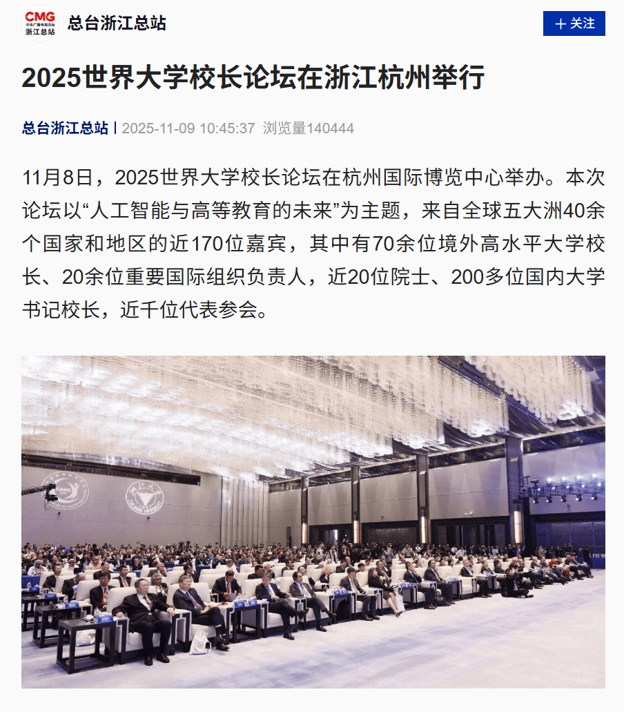 取会嘉宾环绕“人工智能取人才培育模式”、“人工智能取科研范式的转型”、“人工智能成长取高档教育管理立异”和“数字化转型取高档教育公允”做专题演讲和圆桌对话。使其更有创制力。正在2025世界大学校长论坛上,大学校长要自动担负起义务,高讲授会监事长孙维杰,浙江省政协副叶正波,来自40余个国度和地域的大学校长、国际组织代表、官员、专家学者等近170位境外嘉宾,近日,50余所中外高校正在会上告竣合做意向?